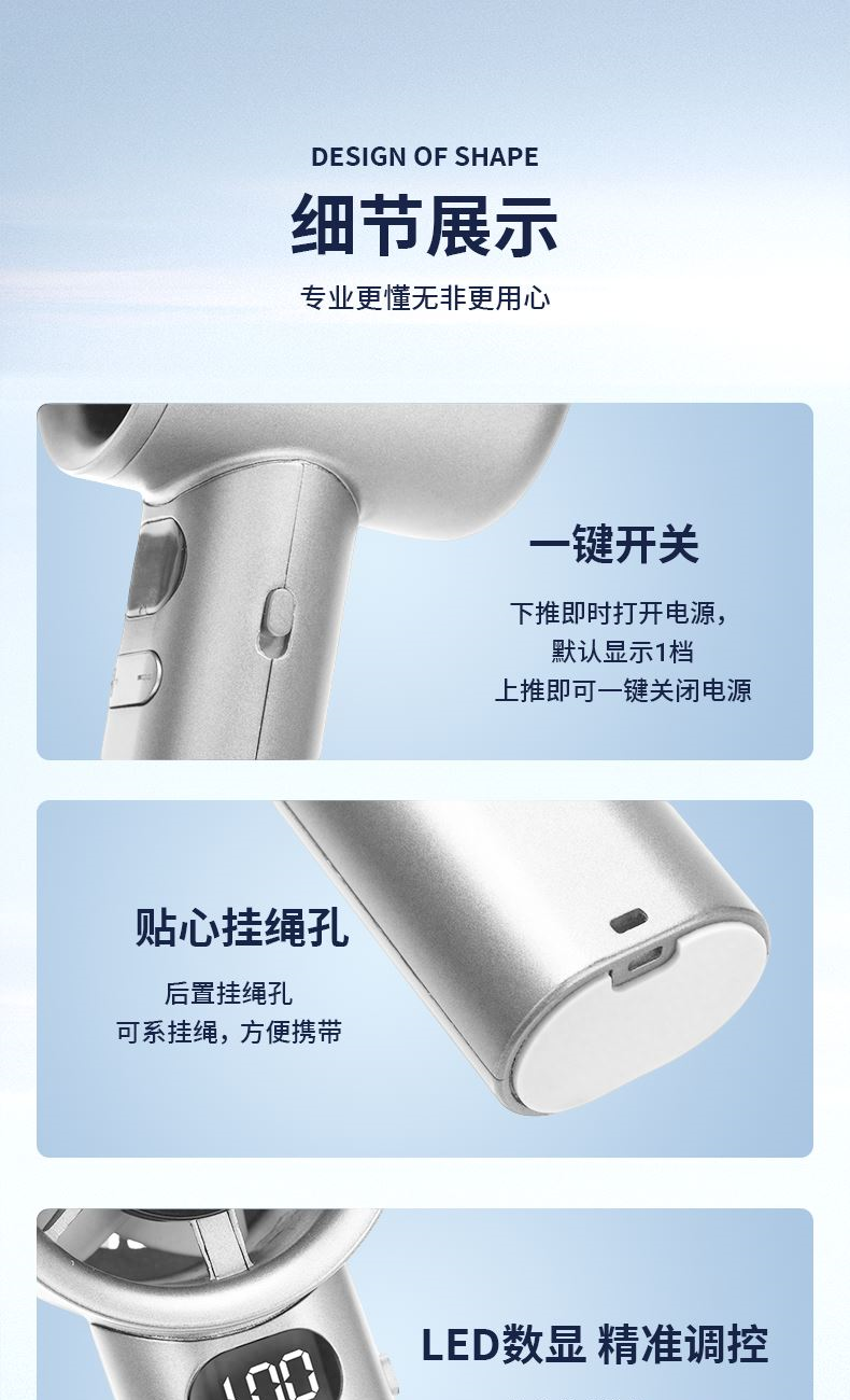 高顏值,大風(fēng)力,長(zhǎng)續(xù)航,2000mAh大容量電池,超大風(fēng) 無(wú)級(jí)變速 靜音 120檔無(wú)極調(diào)速,渦輪增壓出風(fēng)設(shè)計(jì),續(xù)航快充,雙頂配,TYPE-C接口快速充電